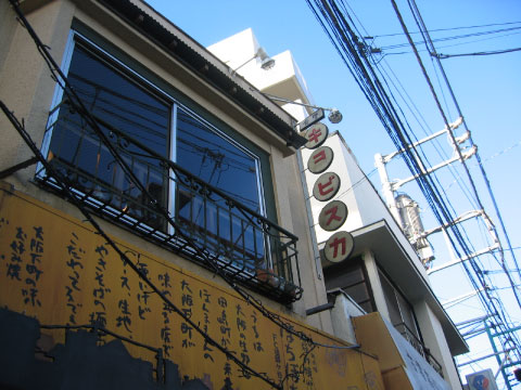 レトロなお好み焼きやさんの上に素敵なキヨビスカの文字