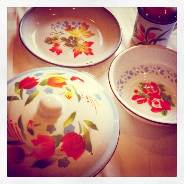 写真は、ホーロー鍋に皿。花柄が可愛らしい!