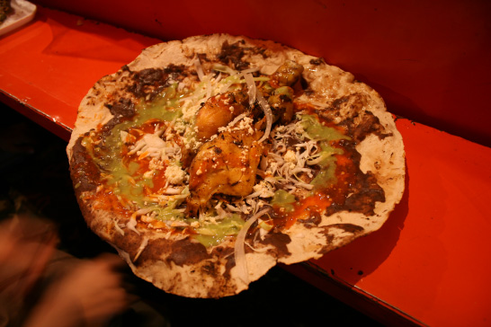大きなトルティージャ(すり潰したトウモロコシから作る、メキシコの伝統的な薄焼きパンのこと)の上に炭火で焼いた肉とチーズ、レタス、チリなどが載っていて、ボリュームのあるピザのようだった。