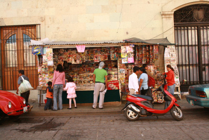 ソカロにはこうしてお菓子がいっぱいはいったカゴを片手に売り歩くおばさんや子供を